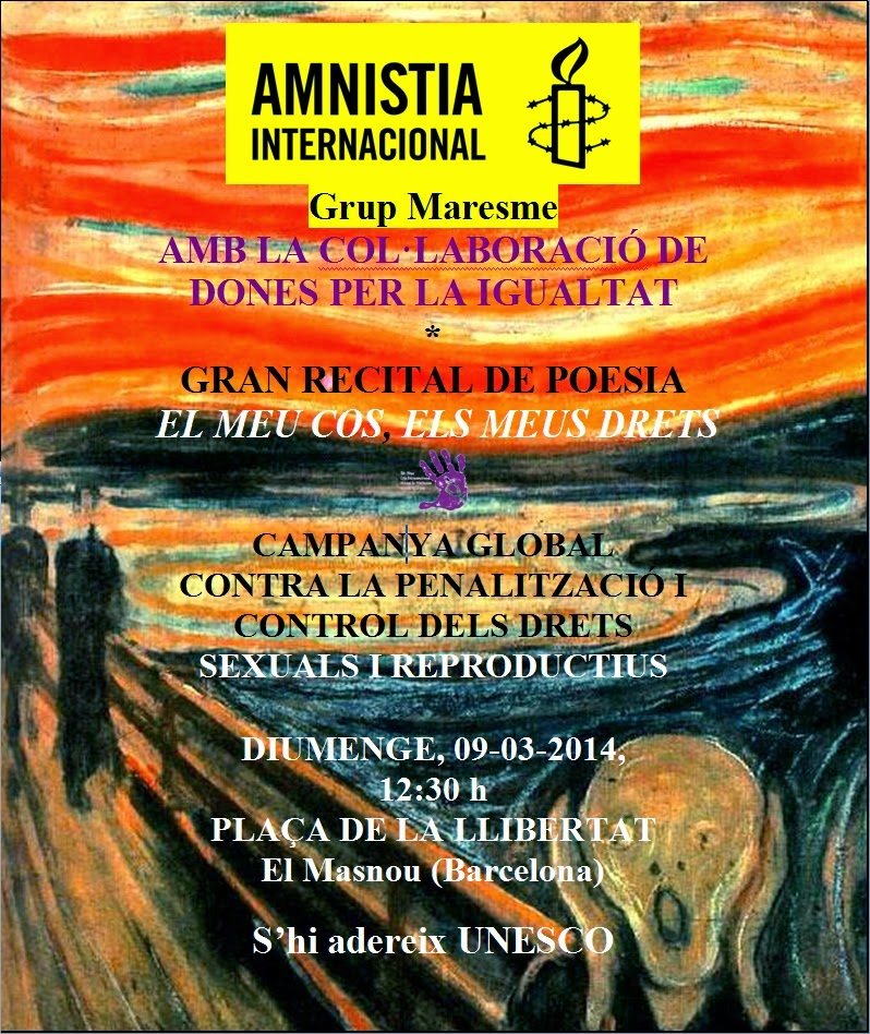 Entorno a los comentarios que suscita el cartel diseñado por Anna Rossell para un acto de Amnistía Internacional - Grupo Maresme (Recital de Poesía en El Masnou: domingo, 09-03-2014 , en la Plaça de la Llibertat de El Masnou, 12:30 h )