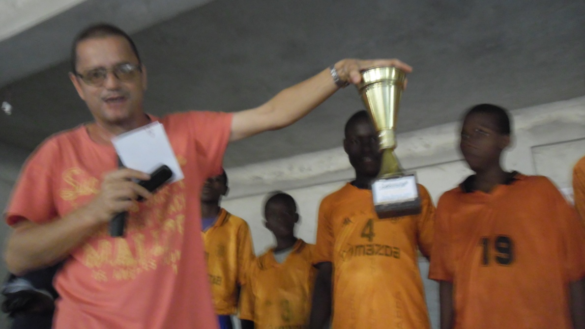 Xec Marquès, amb joves del seu barri de Conakry, a punt de lliurar el premi d'un dels seus campionats de futbol / Xec Marquès, con jóvenes de su barrio de Conakry, en el momento de la entrega del premio de uno de sus campeonatos de futbol.