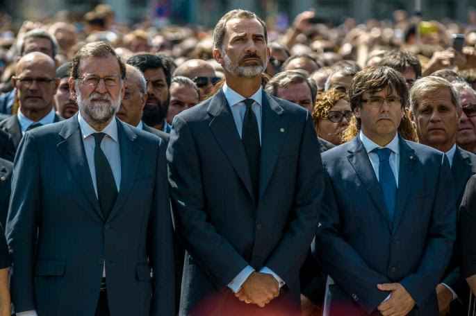 Spanish prime minister Mariano Rajoy, King Felipe VI and Catalan president Carles Puigdemont in a rare moment of unity, observing a minute’s silence for victims of the August terrorist attacksMATTHIAS OESTERLE/ALAMY
