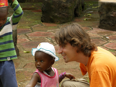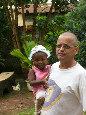 Niña en el Patio Salesiano de Conakry, con Pau Arasa (septiembre 2009)