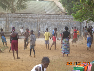 Niñ@s jugando y mujeres esperando el turno del agua en el Patio Salesiano de Conakry (enero, 2009)