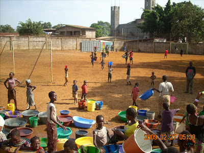 Niños jugando a fútbol y bidones guardando el turno del agua en el Patio Salesiano de Conakry (enero, 2009)