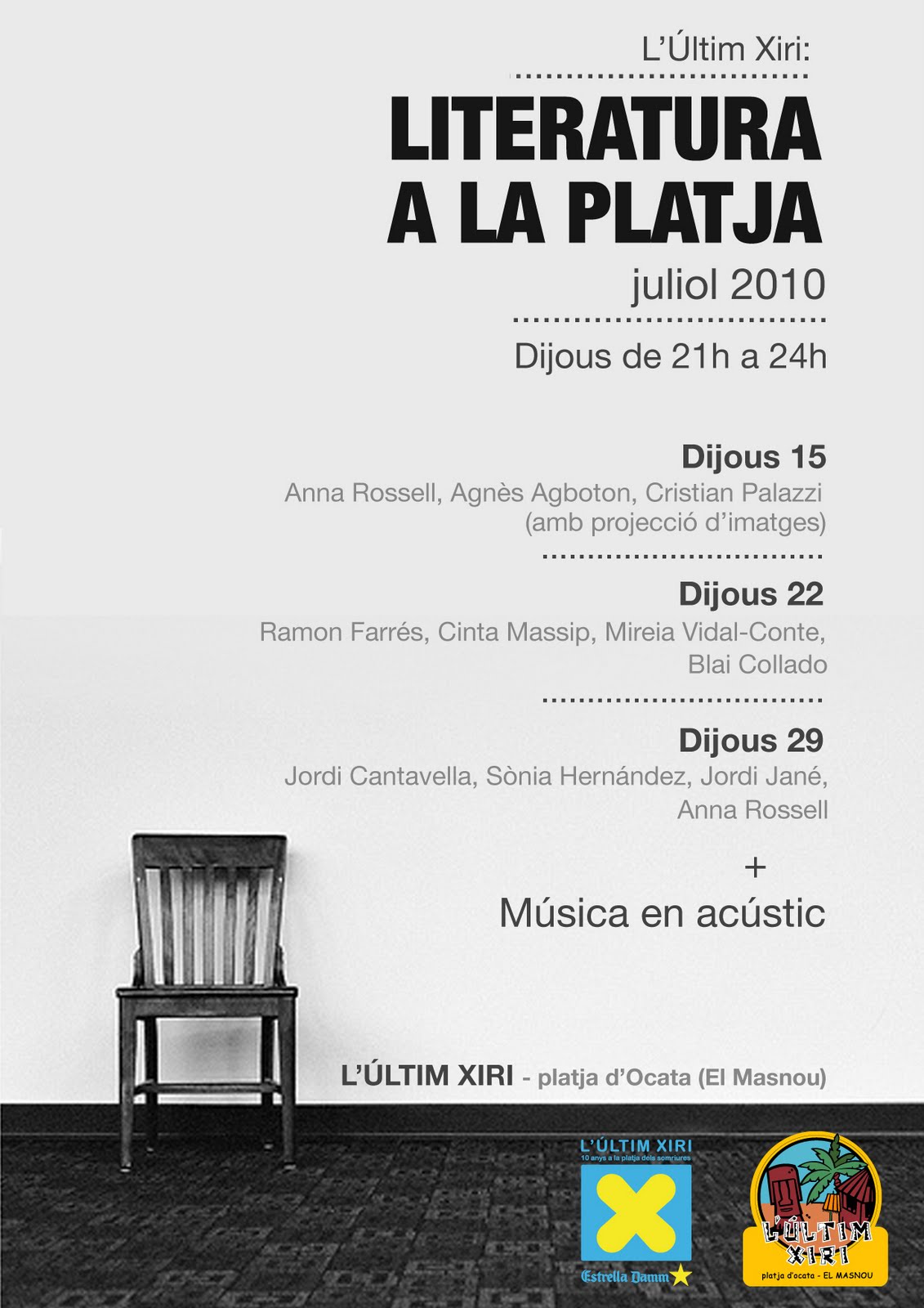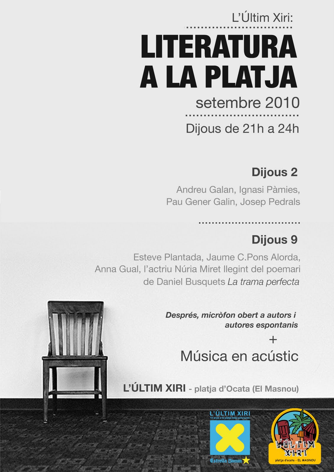 Aquest estiu hem endegat un projecte de tardes-nits de lectura de textos poètics a l' "Último Chiringo" -L' Últim- d'Ocata (El Masnou), el d'en Xavi Giménez. Tot plegat va començar el segon dijous del mes de juliol i a partir de llavors hem continuat tots els dijous i així seguirem fins a mitjans de setembre.